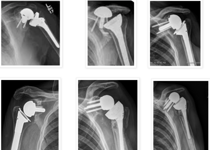 As these x-rays demonstrate, the reverse total shoulder is vulnerable because the baseplate has to resist the upward directed force applied by the humeral component on the glenosphere.