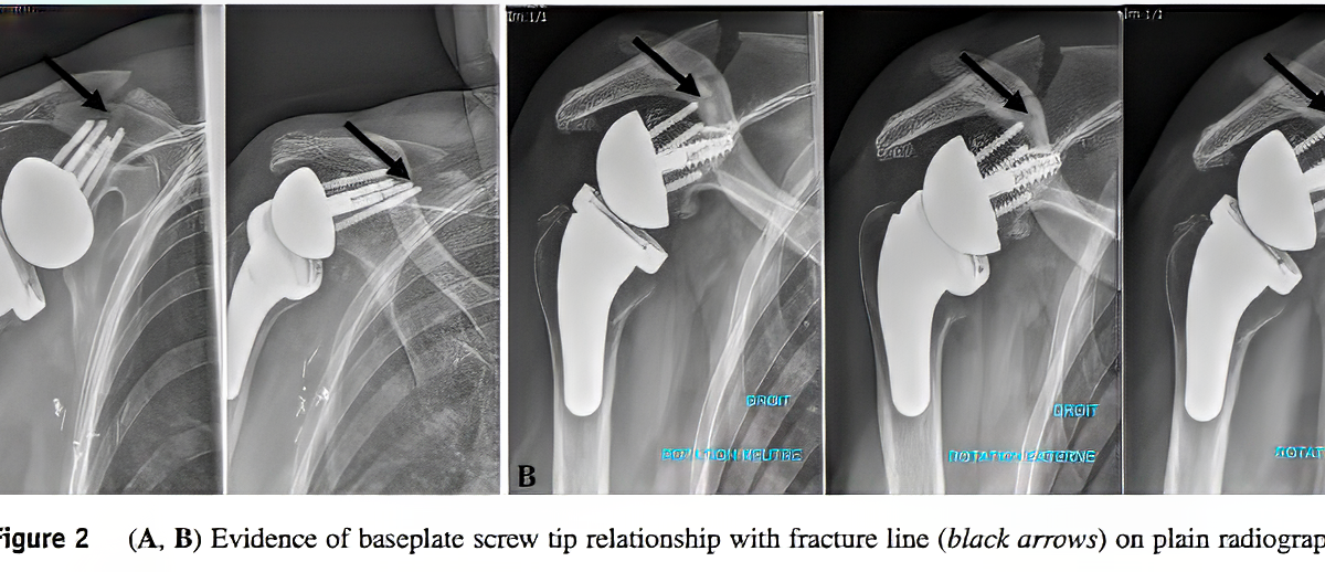 Increased scapular spine fractures after reverse shoulder arthroplasty with a humeral onlay short stem: an analysis of 485 consecutive cases reported: “we found that 57.1% of the scapular spine fractures (12 of 21) occurred at the distal tip of the superior screw”