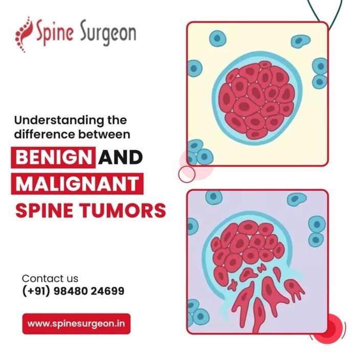 Benign and malignant spine tumors differ significantly in their behavior, growth, and impact on health. Benign spine tumors are typically slow-growing and remain localized, meaning they do not spread to other parts of the body.