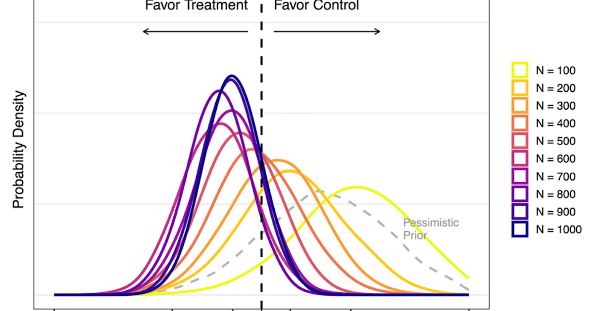 Illustration of the diminishing influence of the prior on the posterior distribution as more data are accumulated. In this example, they began with a pessimistic prior (the control group may perform better). As more data were accumulated, we see a decreased influence of the prior belief on the posterior probability of the treatment effect.
