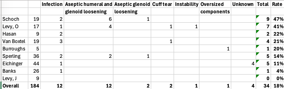 Revision rates and followup durations varied widely: 1/26 at 2.3yrs to 7/17 at 14.5yrs. The indications for revision are shown in this table below drawn from the data in the paper.
